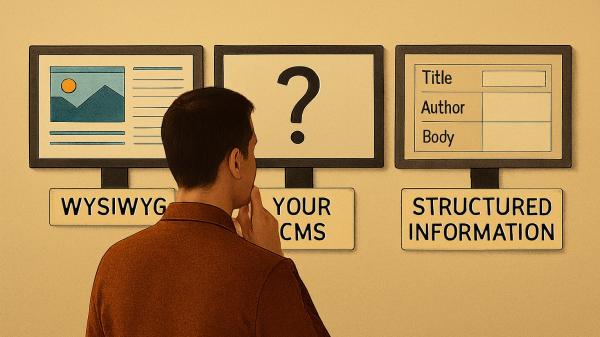 The most important question regarding a CMS is how much we want to separate the content from the design of the website. The answer lies on a scale between two extremes. On one side, we have WYSIWYG editors, which display the content directly within the layout. On the other side, we have structured information, where the content is divided into separate data such as a headline, an image or a phone number.
